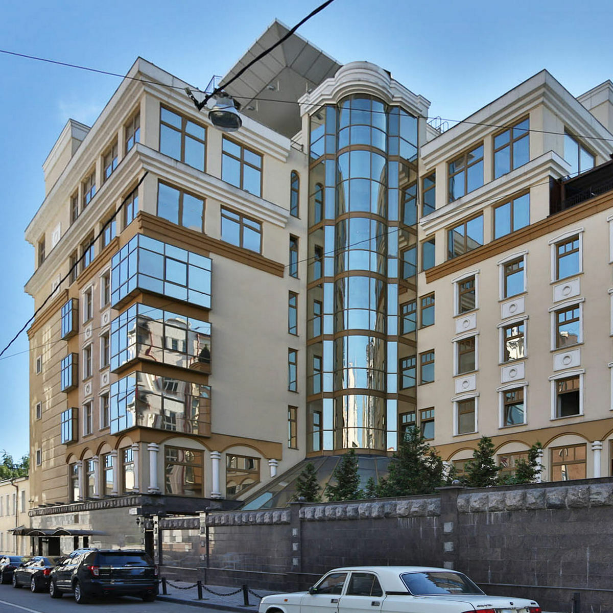 ЖК Посольский Дом — клубный дом на 13 квартир в тихом Борисоглебском переулке, 13 в районе Арбата. Проект включает 2 корпуса, построенные в современном лаконичном стиле с элементами авангарда — полукруглый фасад с панорамными скошенными окнами и соседнее прямоугольное минималистичное здание объединяют стеклянный холл и внутренний благоустроенный уютный дворик, где для жителей оборудовали зоны для отдыха и занятий спортом.