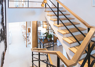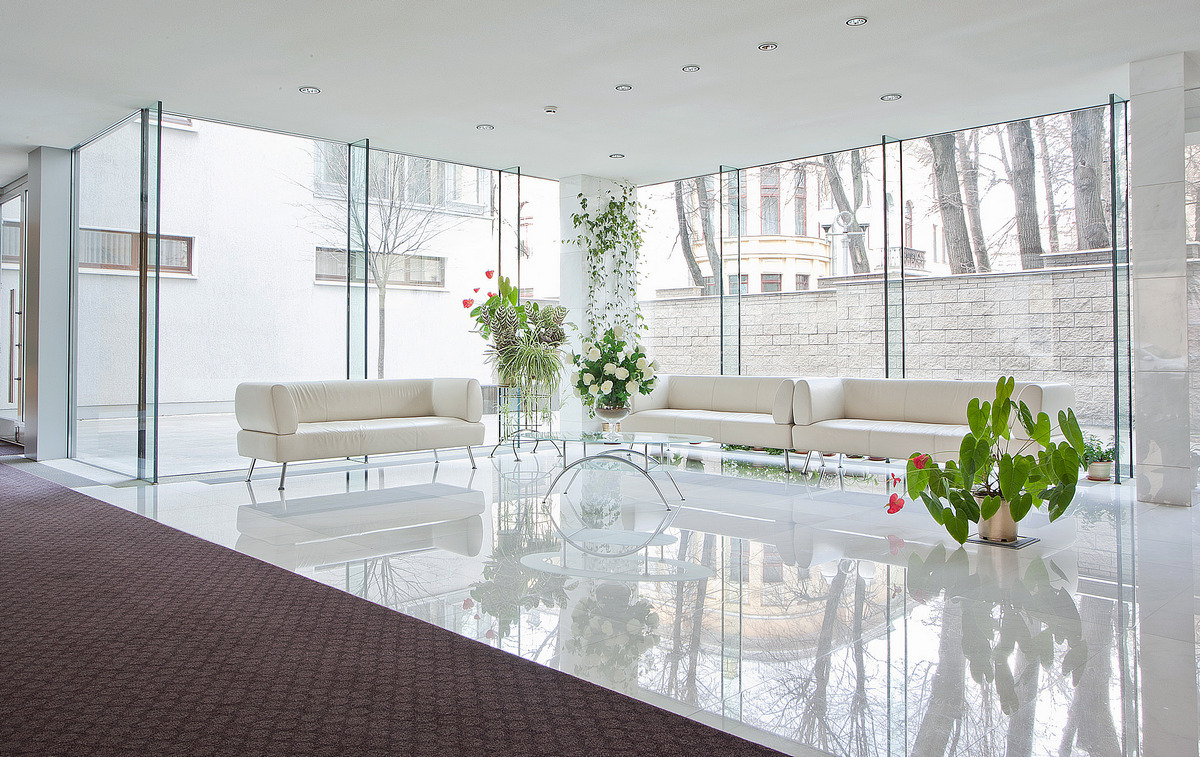 Первый этаж занимает стеклянный лобби-атриум со стойкой консьержа, зоной для встречи и ожидания гостей и прямым выходом во внутренний благоустроенный дворик, где среди изящных клумб и пышных кустарников жильцы могут отдохнуть и укрыться от городской суеты. Подземный паркинг рассчитан на 26 машиномест.