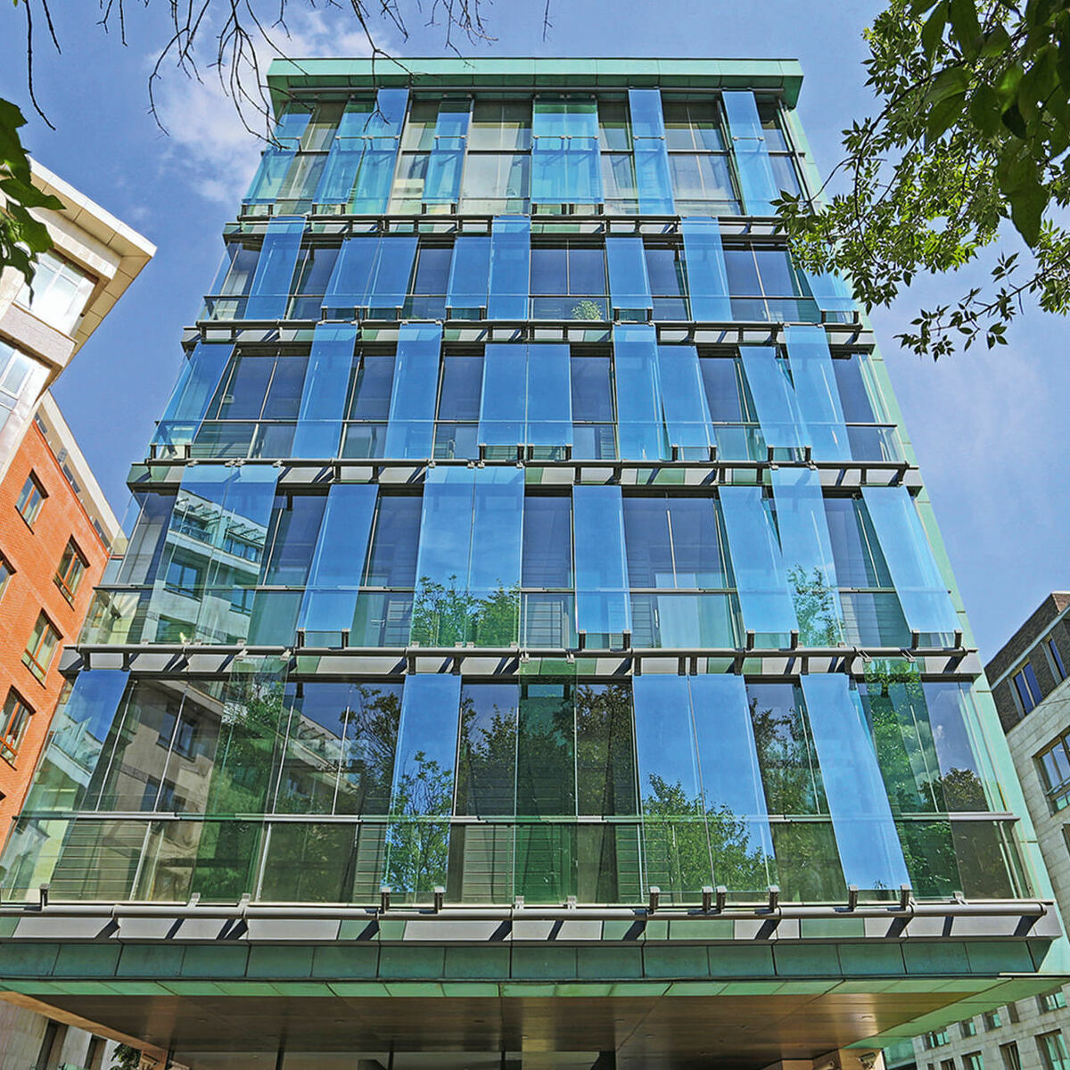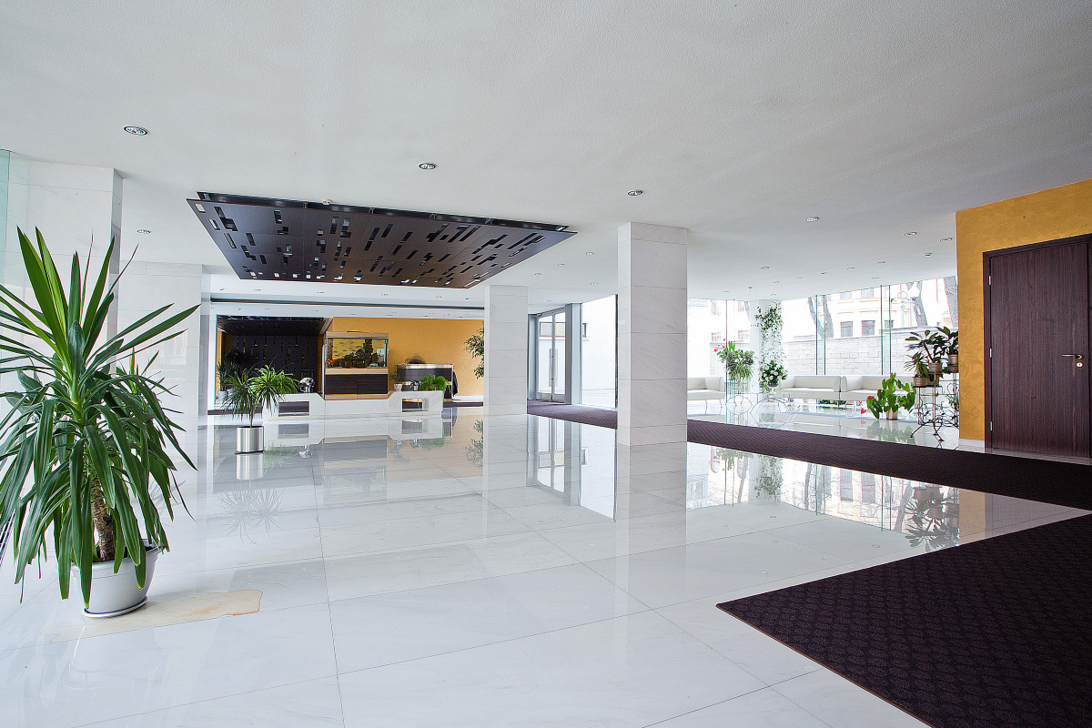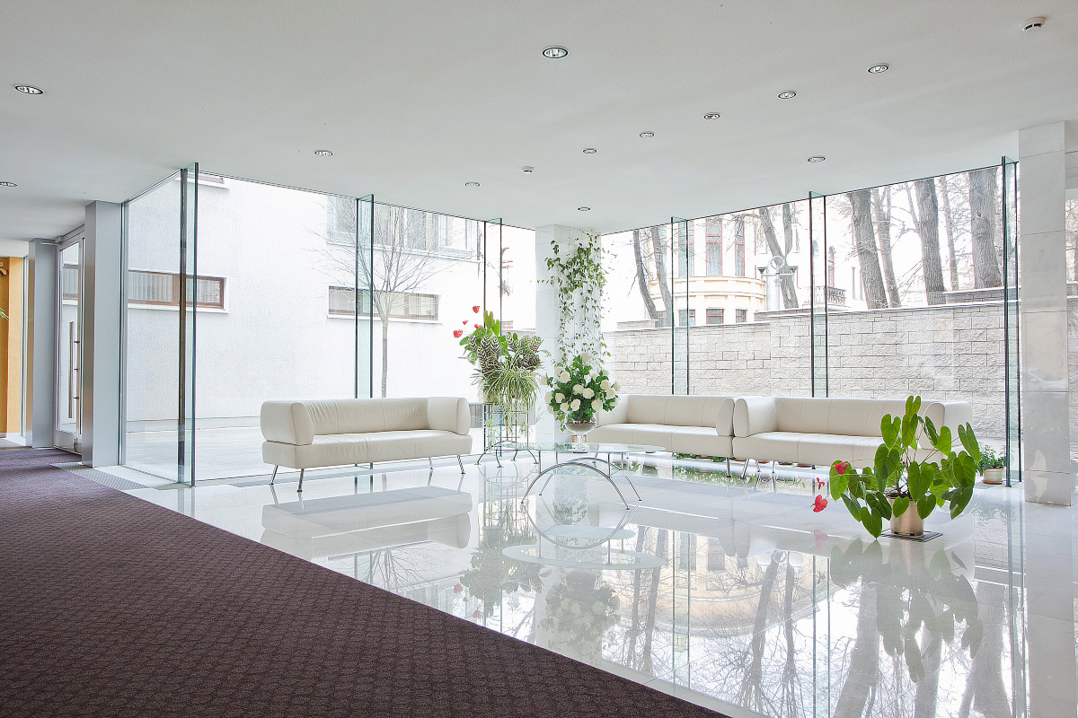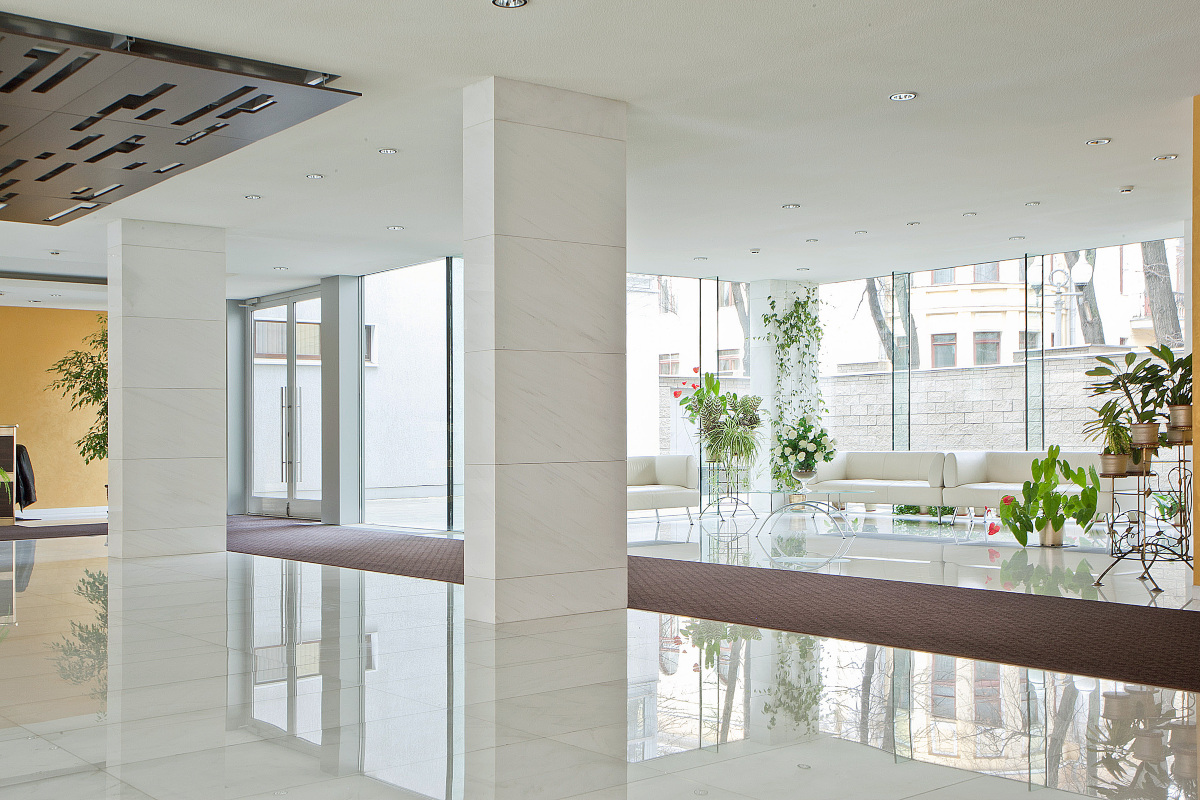 Первый этаж занимает стеклянный лобби-атриум со стойкой консьержа, зоной для встречи и ожидания гостей и прямым выходом во внутренний благоустроенный дворик, где среди изящных клумб и пышных кустарников жильцы могут отдохнуть и укрыться от городской суеты. Подземный паркинг рассчитан на 26 машиномест.